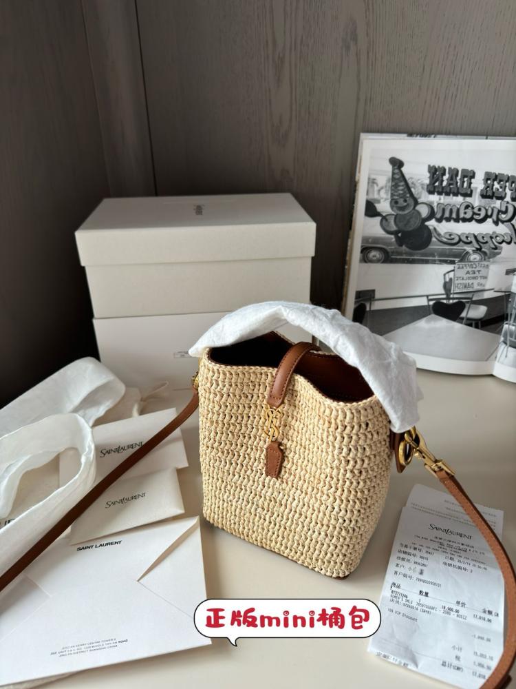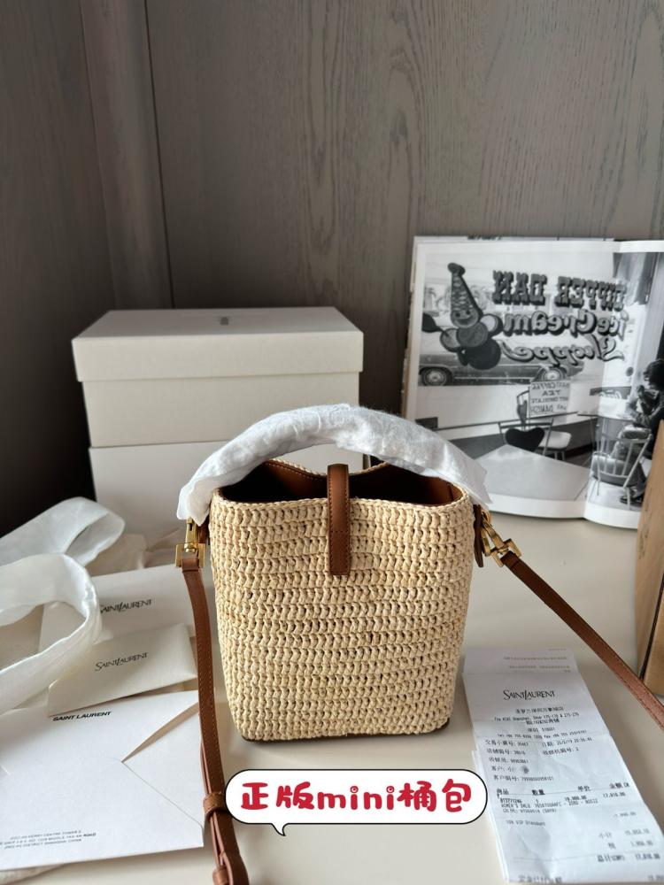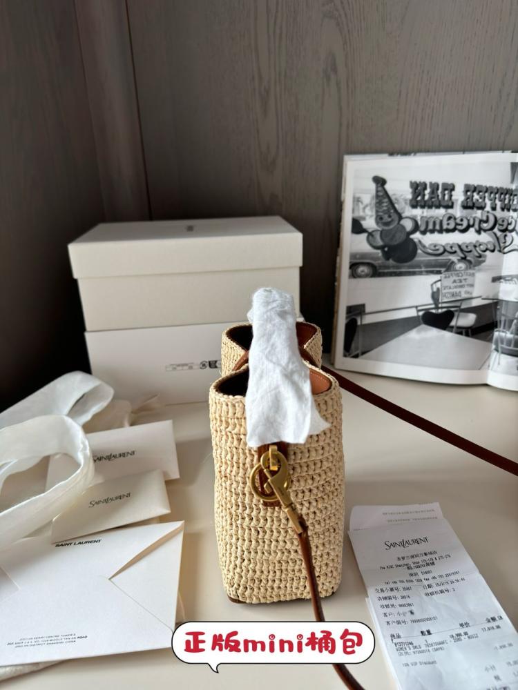 اختاري حقيبة Saint Laurent المصنوعة من الرافيا الطبيعي والجلد البني الفاخر. تصميم مثالي للمواسم الدافئة، يضفي لمسة راقية على إطلالاتك اليومية بكل سهولة وأناقة.