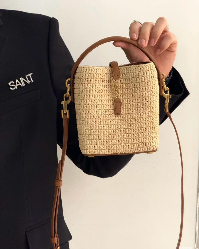 حقيبة Saint Laurent بتصميم أنيق يناسب أجواء الصيف الراقية. مصنوعة يدويًا من خامة الرافيا الطبيعية، وتُزيَّن بلمسات جلدية باللون البني وشعار YSL المعدني. تجمع الحقيبة بين الطابع العملي والفخامة الهادئة التي تُميّز أسلوب الدار.
