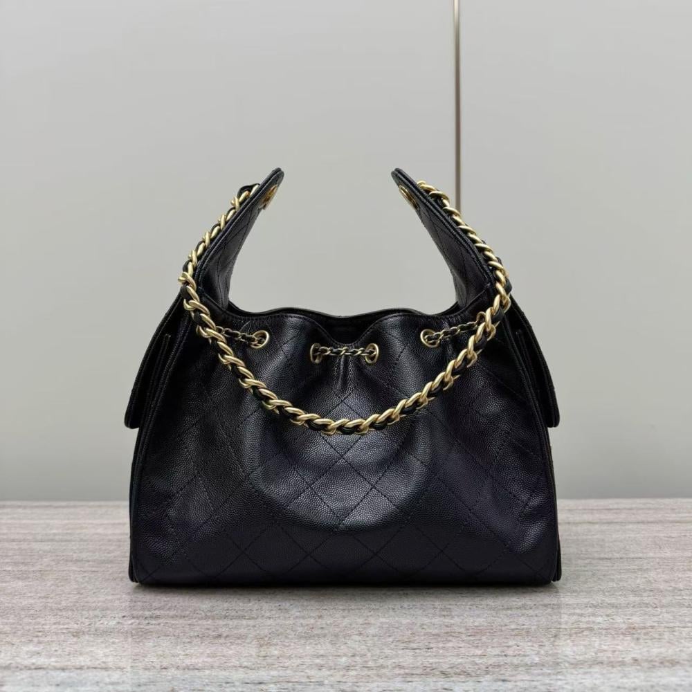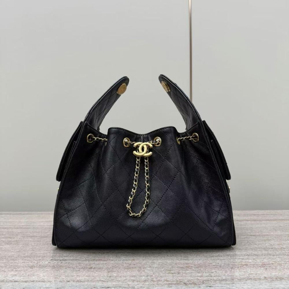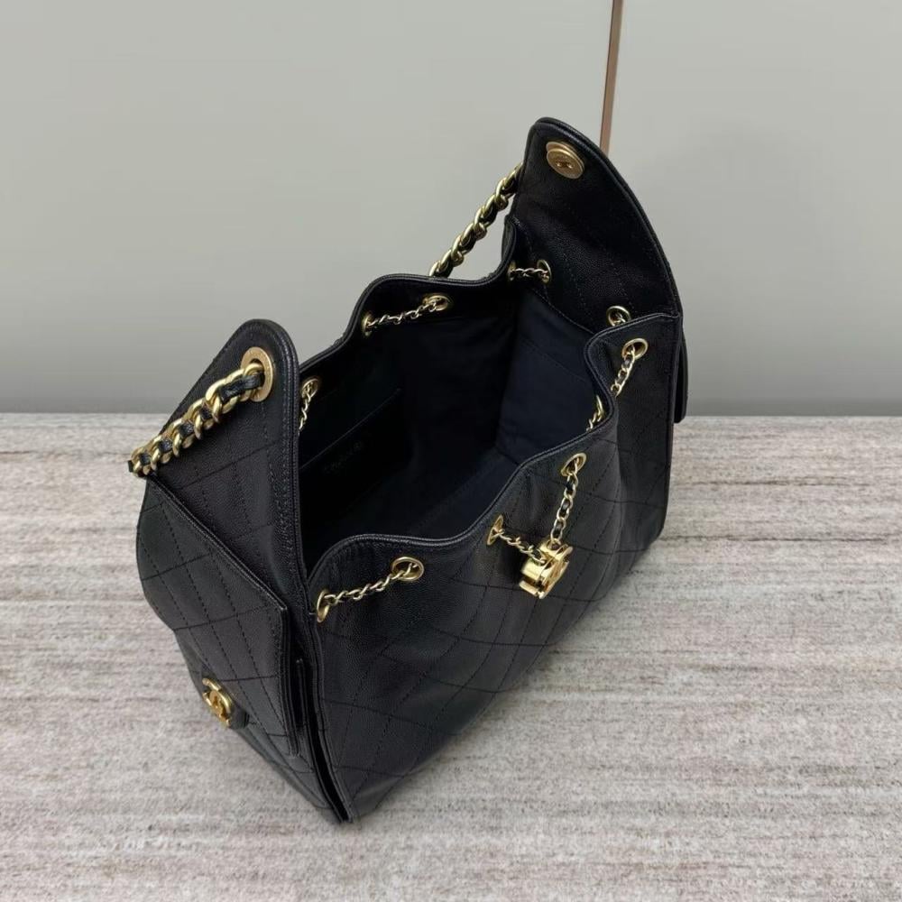 حقيبة Chanel Drawstring Bag المصنوعة من جلد الكافيار الأسود المميز بنقشة مربعات كلاسيكية، تأتي بتصميم عملي بسحب السلسلة لتعديل الإغلاق، وتفاصيل ذهبية أنيقة تعكس هوية شانيل الفاخرة. الحقيبة تجمع بين الطابع اليومي الفخم والأسلوب الكلاسيكي المتجدد.
