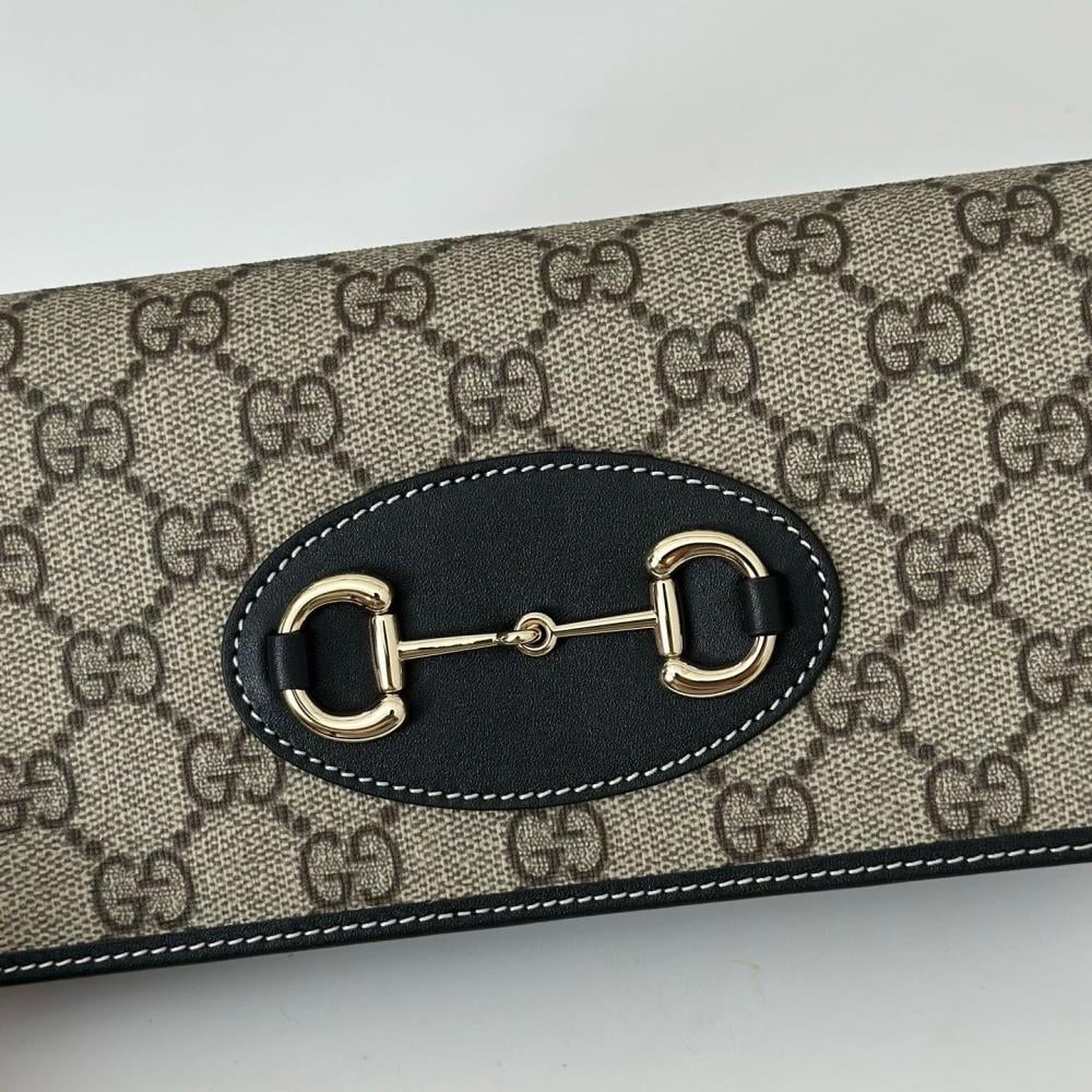 محفظة Gucci Horsebit 1955 Chain Wallet بتصميم فاخر يجمع بين أناقة الخطوط الكلاسيكية ولمسات عصرية راقية. تأتي بخامة GG Supreme الكلاسيكية ، وتُزيَّن بتفصيل الحلية المعدنية Horsebit الأيقونية على الغلاف الأمامي، ما يمنحها لمسة فاخرة.