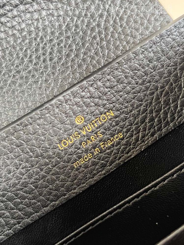 حقيبة Louis Vuitton Capucines Mini باللون الأسود، بتصميم أنيق وهيكل مصغّر مصنوع من الجلد الطبيعي المحبّب الفاخر. تتزين في المقدمة بشعار LV الشهير بإطار معدني لامع ملوّن بلمسة ناعمة، يمنح الحقيبة حضوراً أنثويًا فخمًا دون مبالغة.