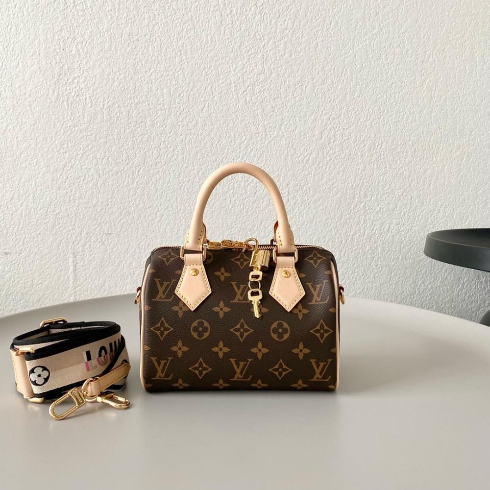 حقيبة Louis Vuitton Speedy Bandoulière الصغيرة تأتي بتصميم أيقوني من قماش المونوقرام الكلاسيكي، مع لمسات من الجلد الطبيعي الفاتح ولمعة معدنية ذهبية فاخرة. تصميمها الأسطواني الأنيق يجعلها قطعة مثالية للإطلالات اليومية العصرية.