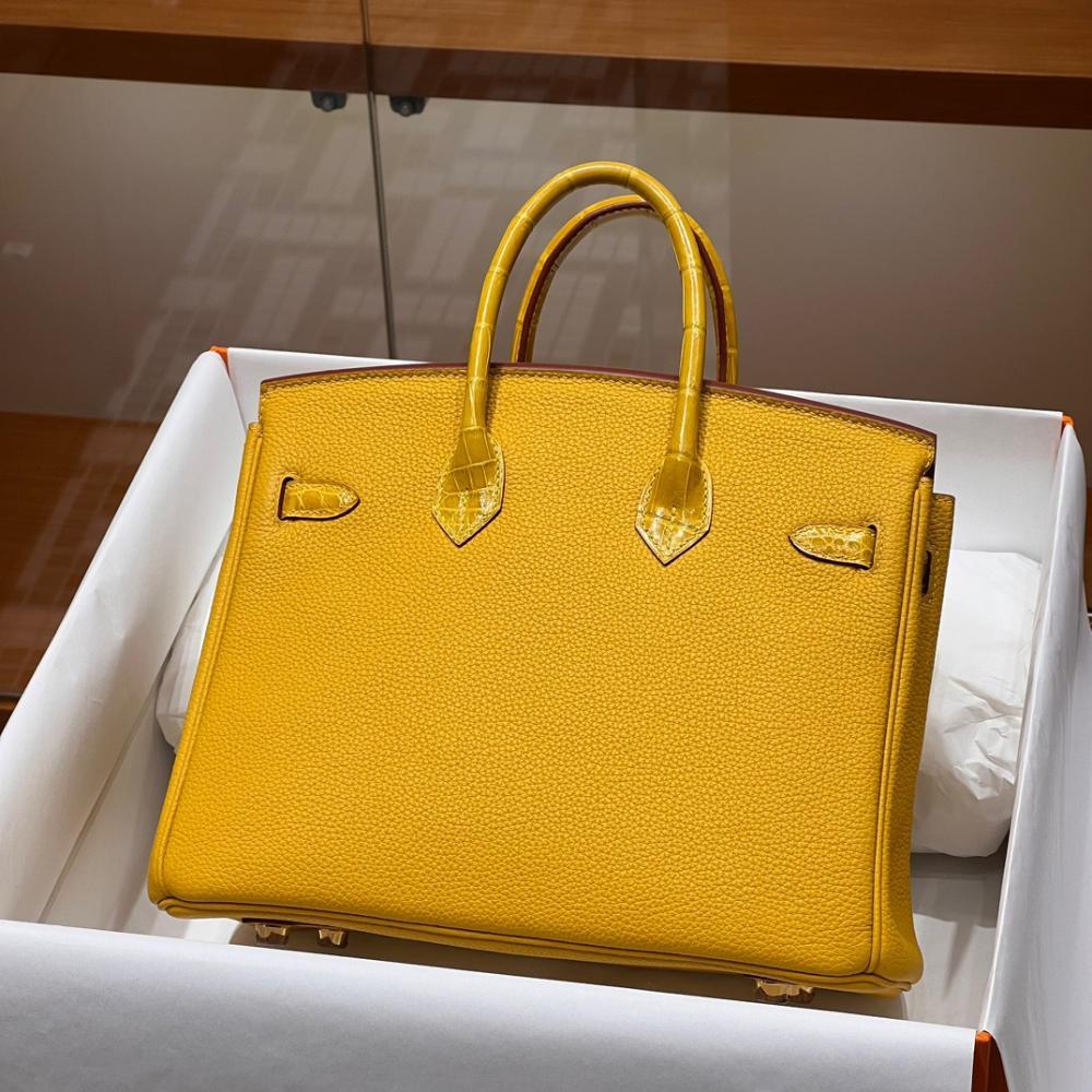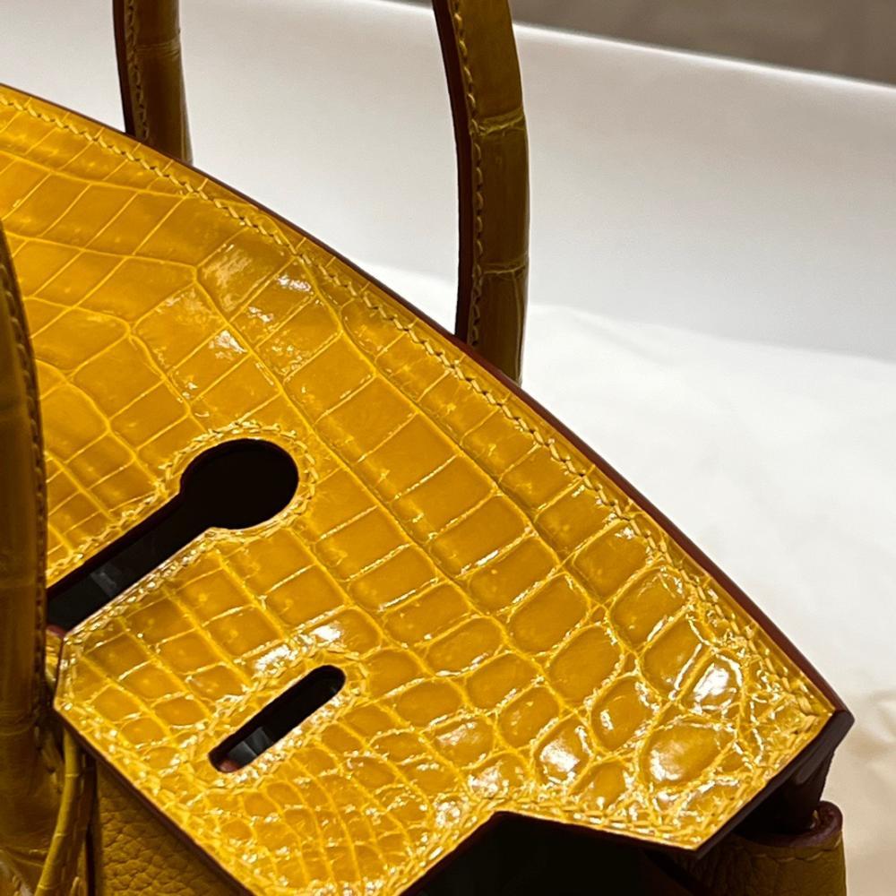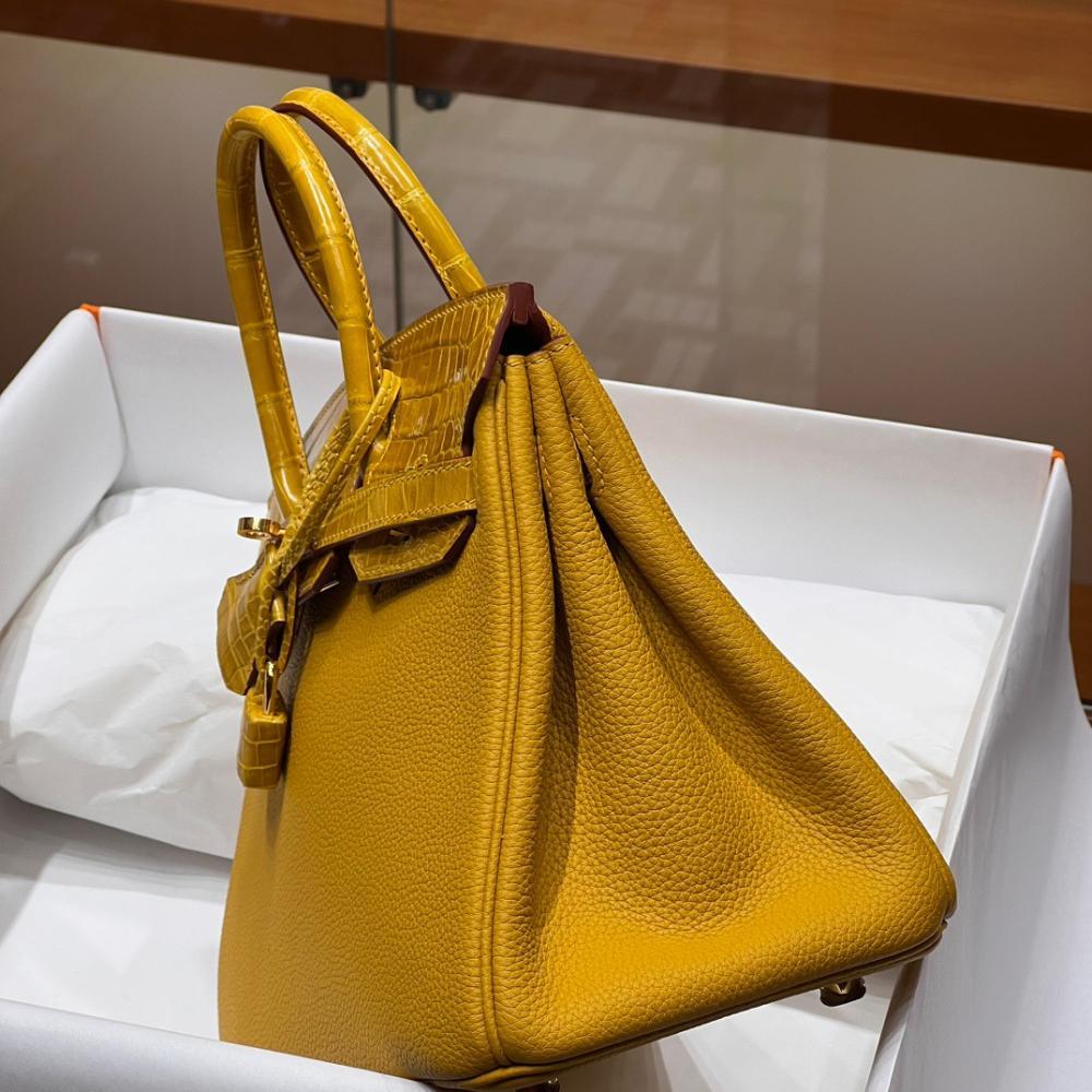 حقيبة Birkin من Hermès بتصميم فاخر بلون مشرق، مصنوعة من جلد طبيعي وتُزيَّن بلمسات لامعة من جلد التمساح بلون متناغم. تصميم يُبرز الحقيبة كقطعة فنية استثنائية.