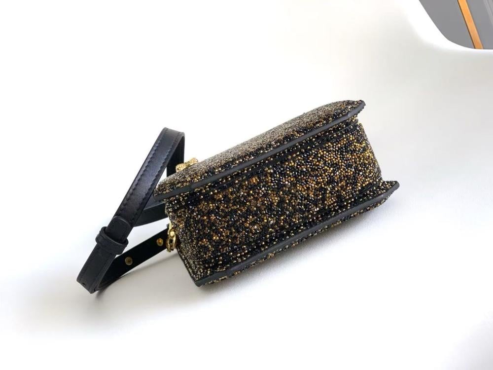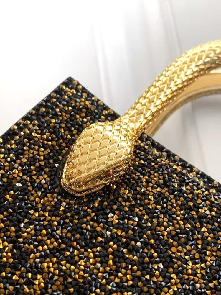 شنطة بولغري بتصميم عمودي فاخر تأتي مرصّعة بكريستالات سوداء وذهبية، تعكس الضوء بإيقاع مميز وأنيق. يلتف المقبض الذهبي على شكل أفعى حول الشنطة بأسلوب نحتي أنيق، مستوحى من رمز Serpenti الأيقوني.