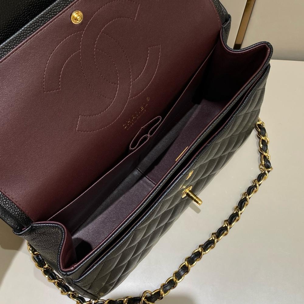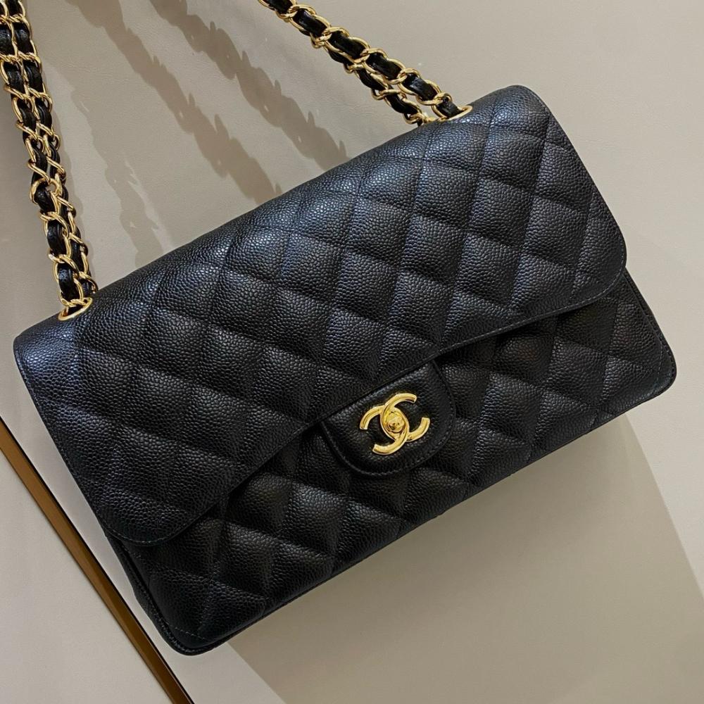 حقيبة Chanel Classic Bag بتصميمها الأيقوني والمبطن على شكل مربعات تعتبر من أكثر قطع الدار شهرة وأناقة. مصنوعة من جلد الكافيار الطبيعي المعروف بملمسه الفاخر، وتتميّز بإغلاق Signature CC وشريط السلسلة المزدوجة المتداخل مع الجلد.